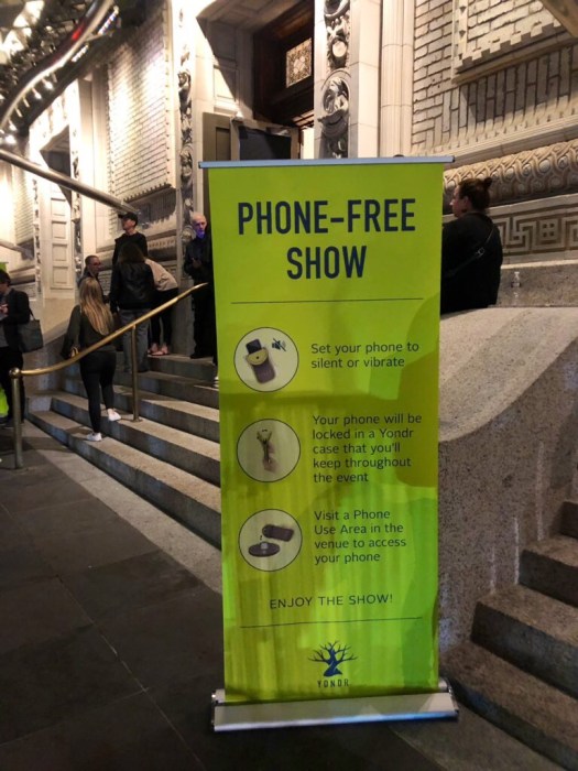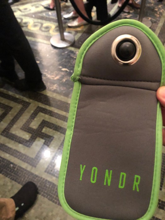 観客のスマホは、セキュリティーチェック後に、スタッフによりYondrというスマホケースに入れられて、特殊キーでロックされてしまいます。ケースは透明ではないので、画面操作、確認はできません。